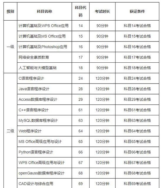 本次NCRE开考全部4个级别的26个科目,级别及科目信息详见下表。
