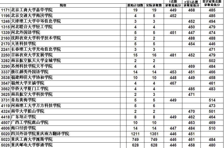 院校原始计划数实际录取数录取最底分录取最低分