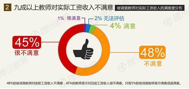 腾讯教育通过近42万份调查,试图展示教师群体目前的生存状况,分压力状况、收入状况,社会地位感知三部分。总体来看,逾八成教师表示工作压力大,六成以上教师工资收入在1001-3000元之间,八成以上教师认为其社会地位低,而近五成教师表示绝对不会让其子女从事教师职业。