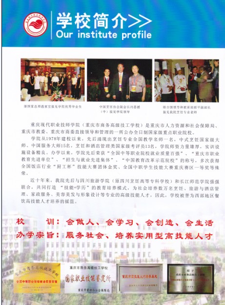 重庆现代职业技师学院,是由重庆市商业委员会、重庆市人力资源和社会保障局及重庆市教育委员会共同管理的一所集高级技工学校、成人中专为一体的国家级重点公办中等职业学校,学校始建于1978年,前身为重庆市饮食服务技工学校,现是隶属于重庆市商业委员会、全额财政拨款的市属事业单位。