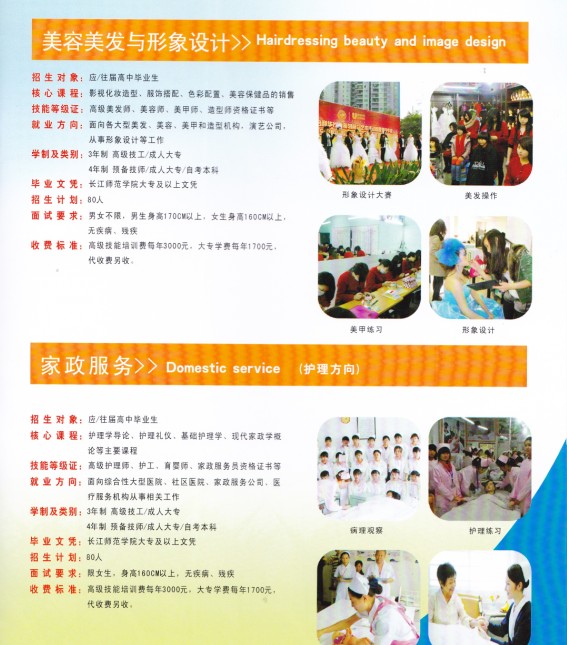 中专招生专业:烹饪工艺与营养护理、美容美发、旅游与酒店管理、机电一体化、电子信息技术、会计电算化、平面设计