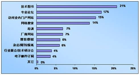此项调查数据显示,“技术图书、专业论坛、业内门户网站、搜索引擎”是嵌入式工程师获取知识的主要途径(接近70%),其中各项所占比例分别为21%、17%、15%、 14%,网络已经成为工程师获取专业知识的主要途径。除了以上4大途径外,部分工程师也会通过培训、厂商网站、博客/群组、杂志/期刊/报纸、行业展会 /技术研讨会以及电子邮件订阅等途径获取信息。华清远见提供的免费电子图书、视频教程等资料每年下载次数已达到十多万。