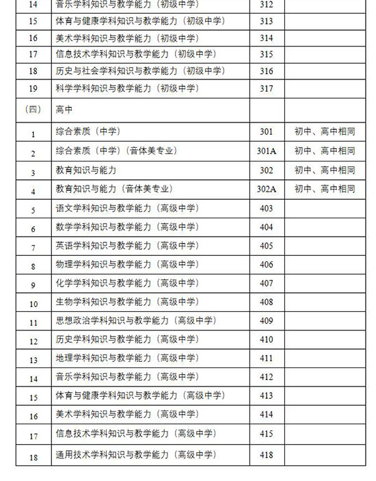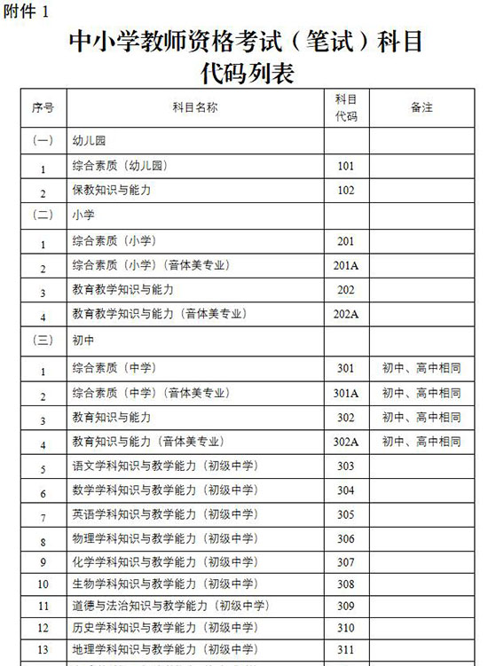 附件:1.中小学教师资格考试(笔试)科目代码列表