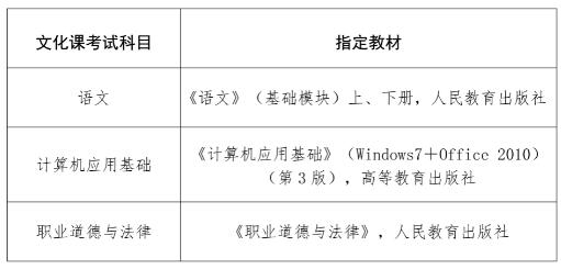 1.文化课考试方式。文化课采取笔试的考试方式,实行全省统一命题、统一考试、统一评卷,由省考试局负责组织实施。考试内容为我省中职学校所开设课程的基本知识,各科指定教材详见下表: