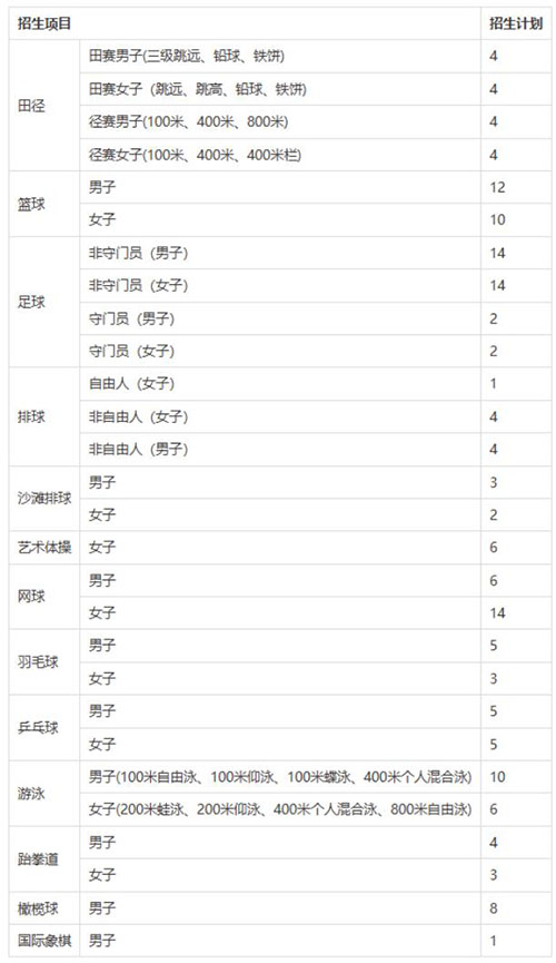 (二)足球、乒乓球、排球、沙滩排球、艺术体操、游泳、跆拳道、橄榄球、国际象棋要求一级运动员(含)以上运动技术等级称号,其他招生项目要求二级运动员(含)以上运动技术等级称号。