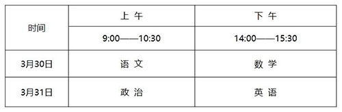 1.考试科目:语文、数学、政治、英语;考试分值:每科150分,总分600分,使用国家通用语言文字作答。
