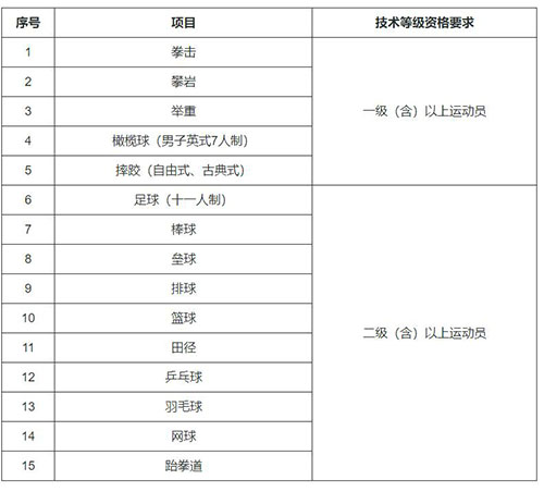 3.考生必须具备所列招生项目之技术等级资格要求(等级证书审批日期:2014年1月1日——2024年3月10日),以“国家体育总局运动员技术等级系统”公布的数据信息为准。