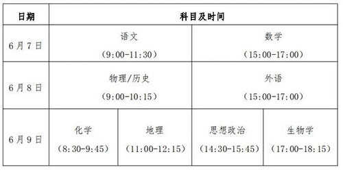 考试时间安排在6月7日至9日。语文科目考试时长为150分钟,数学、外语科目考试时长为120分钟,选择性考试科目考试时长均为75分钟。具体考试时间为: