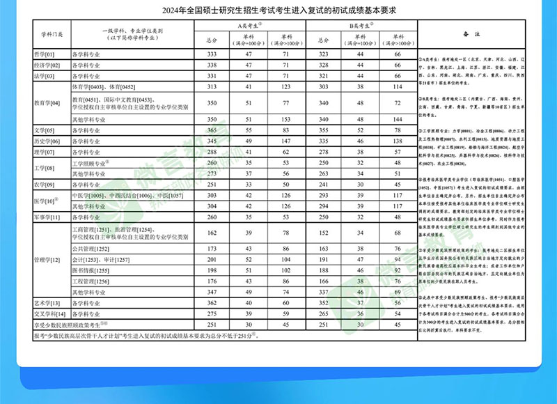 近日,教育部部署2024年全国硕士研究生招生复试录取工作,同时发布了《2024年全国硕士研究生招生考试考生进入复试的初试成绩基本要求》即国家分数线。各招生院校单位根据《2024年全国硕士研究生招生工作管理规定》,在国家分数线的基础上,自主确定并公布报考本单位的考生进入复试的初试成绩要求及其他学术要求。