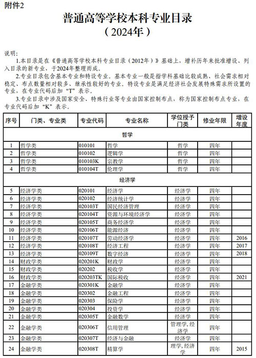 按照教育部等五部门印发的《普通高等教育学科专业设置调整优化改革方案》(教高〔2023〕1号)有关要求,根据《普通高等学校本科专业设置管理规定》(教高〔2012〕9号),我部组织开展了2023年度普通高等学校本科专业设置和调整工作。经申报、公示、审核等程序,对各地各高校向我部申请备案的专业予以备案;根据高等学校专业设置与教学指导委员会评议结果,确定了同意设置的国家控制布点专业和尚未列入专业目录的新专业名单,并将资源勘查工程、护理学、助产学调整为国家控制布点专业。现将备案和审批结果(附件1)、《普通高等学校本科专业目录(2024年)》(附件2)一并予以公布。请各地各高校加强对新设专业的建设和管理,不断提高人才培养质量。