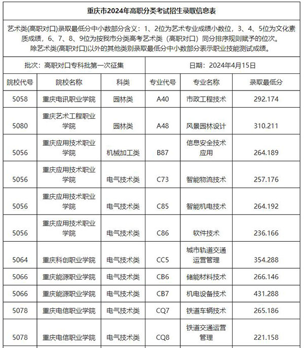 2024年重庆高职分类考试对口专科批(第一次征集)招生录取情况发布时间:2024/4/19 9:35:24 | 人感兴趣 | 评分:3