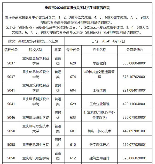 2024年重庆高职分类考试专科批(第二次征集)招生录取情况发布时间:2024/4/24 10:27:14 | 人感兴趣 | 评分:3
