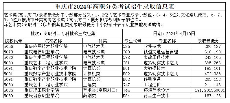 2024年重庆高职分类考试对口专科批(第3次征集)招生录取情况发布时间:2024/4/25 10:18:53 | 人感兴趣 | 评分:3
