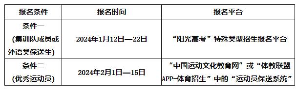 2.依据条件二申请的考生,按照体育总局办公厅的相关要求报名(具体参见《体育总局办公厅关于做好2024年高校保送录取优秀运动员有关事宜的通知》),且须同时报名并参加2024年普通高校运动训练、武术与民族传统体育专业招生文化考试(具体考试安排见《2024年普通高等学校运动训练、武术与民族传统体育专业招生管理办法》)。