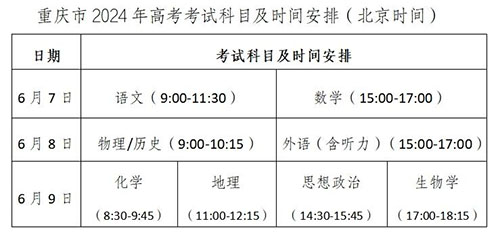 2024年普通高考时间温馨提醒重庆市2024年普通高校招生统一考试(以下简称“高考”)将于6月7日—9日举行。为确保广大考生顺利参考,现将考试相关事宜温馨提醒如下: