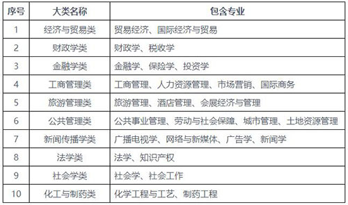 第七条 学校有经济与贸易类、财政学类、金融学类、工商管理类、旅游管理类、公共管理类、新闻传播学类、法学类、社会学类和化工与制药类10个大类招生(含28个专业),其余专业按具体专业招生。