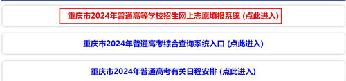 登录重庆教育考试院官网或重庆招考网,点击“重庆市2024年普通高等学校招生网上志愿填报系统”