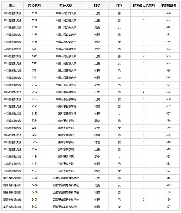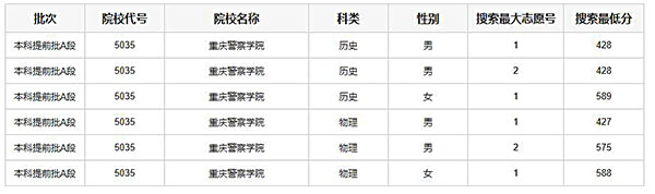 本科层次:对符合相关条件且填报有本科层次公安专业志愿的重庆户籍考生,按照志愿优先的原则,在我市普通类本科录取控制线上,区分院校、科类(首选科目)、性别,依据文化成绩从高分到低分,按照招生计划数的5倍(重庆警察学院4倍)确定。先搜索一志愿,再搜索二志愿,搜索最大志愿号为“1”表示一志愿生源已足,不再搜索二志愿,其搜索最低分为一志愿入围考生最低分;搜索最大志愿号为“2”表示一志愿本科批控制线上考生已全部入围,其搜索最低分为二志愿入围考生最低分。公安院校国家专项计划合格生源不足的,将从高分到低分依序递补符合国家专项计划资格考生。