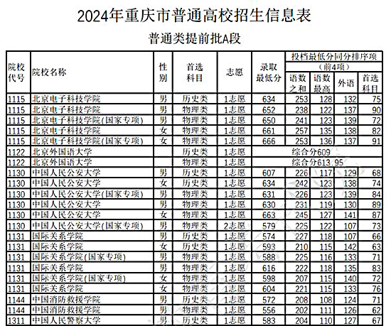 根据重庆招考网发布的信息,关于2024年普通高校招生信息表——普通类提前批A段,具体内容如下: