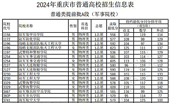 根据重庆招考网发布的信息,关于2024年普通高校招生信息表——普通类提前批A段(军事院校),具体内容如下: