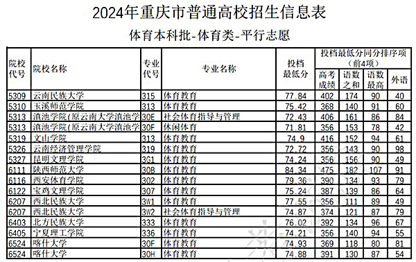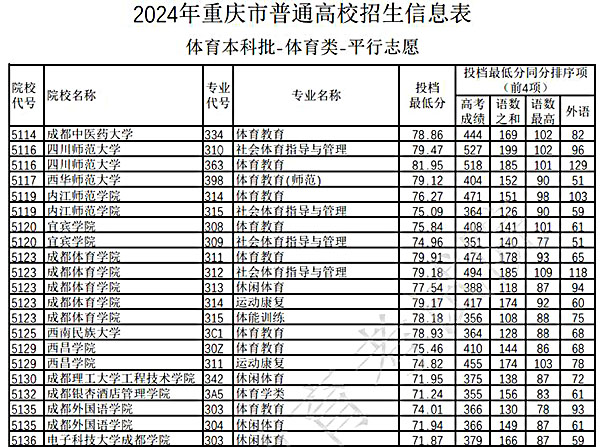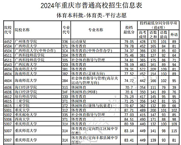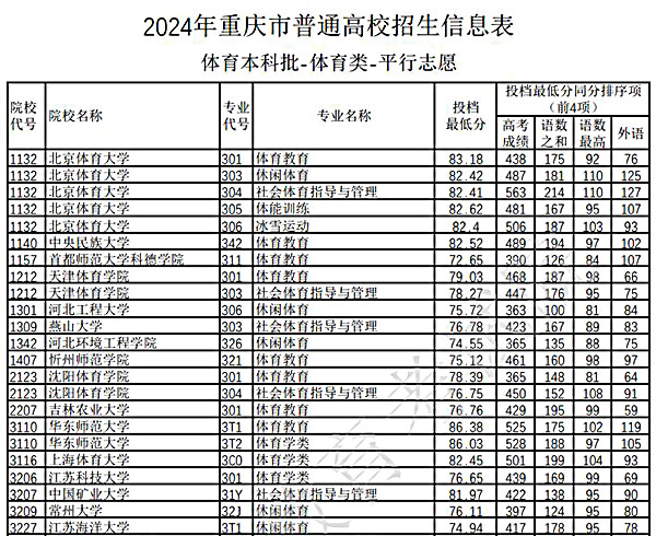 根据重庆市教育考试院发布,关于2024年普通高校招生信息表——体育类本科批(平行志愿),具体内容如下: