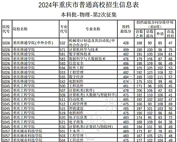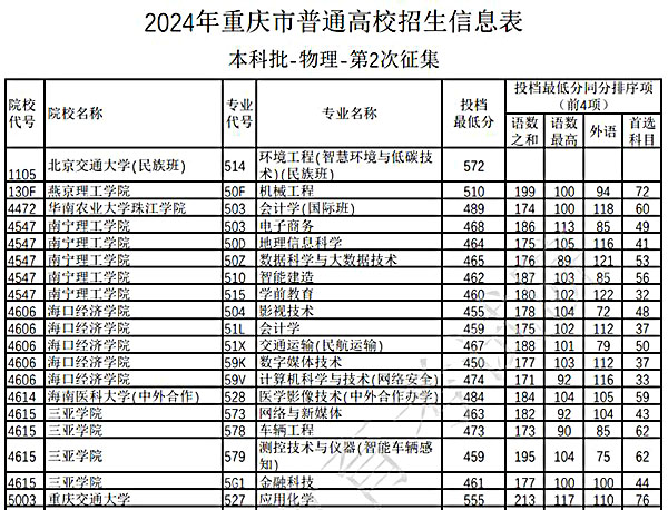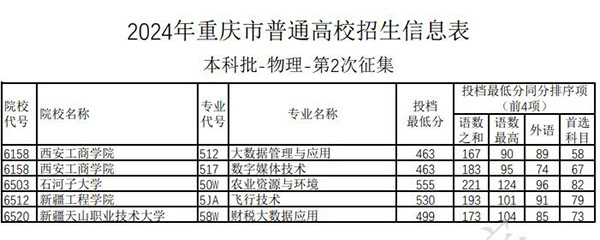 2024年重庆普通高校本科批(物理)第2次征集招生信息