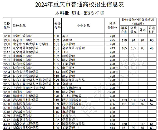 据重庆市教育考试院发布,关于2024年度重普通高校本科批(历史)第3次征集志愿招生信息已公布,具体如下:(点击可查看大图)