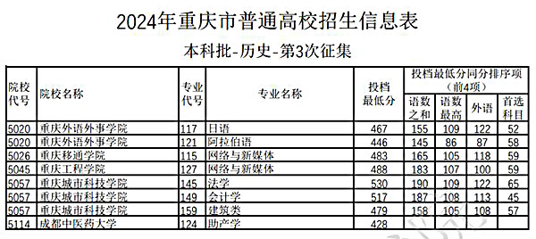 2024年重庆普通高校本科批(历史)第3次征集招生信息