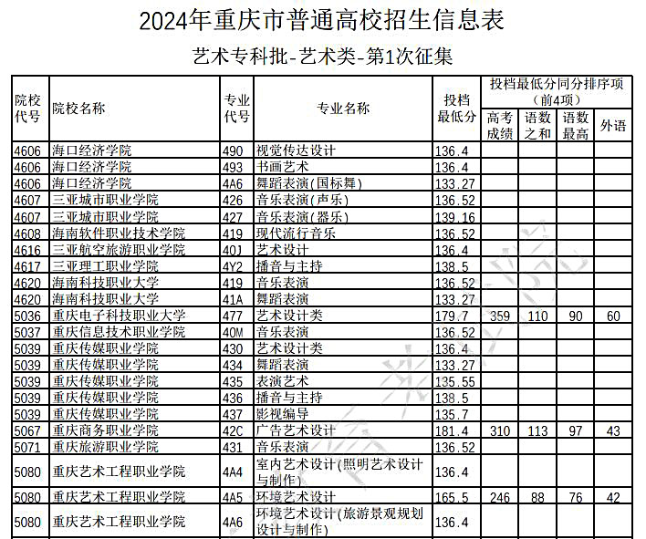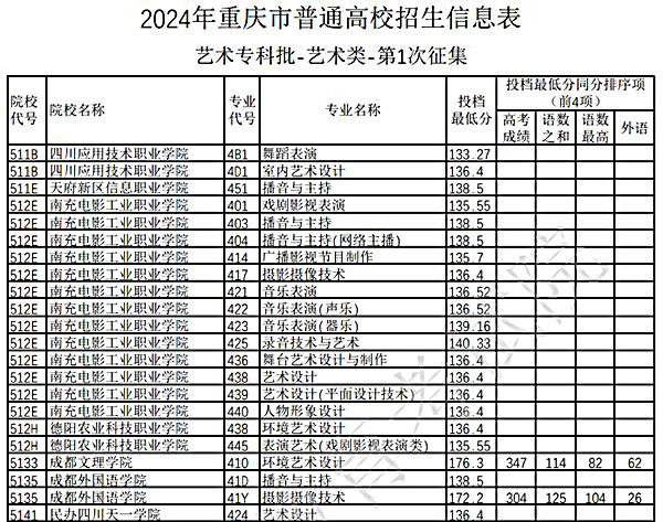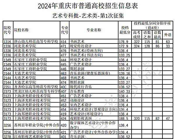 据重庆市教育考试院发布,关于2024年度重普通高校艺术类专科批第1次征集志愿招生信息已公布,具体如下: