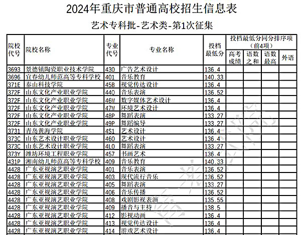 2024年重庆普通高校艺术类专科批第1次征集招生信息