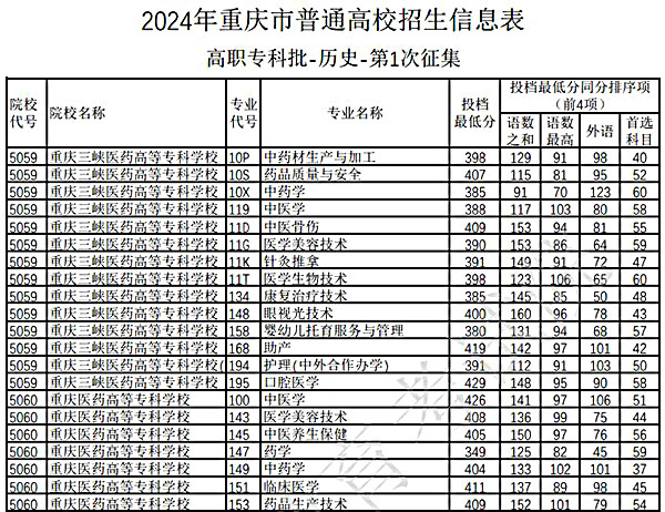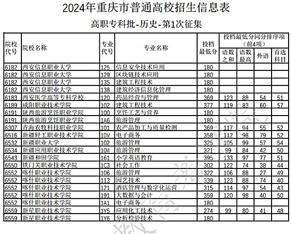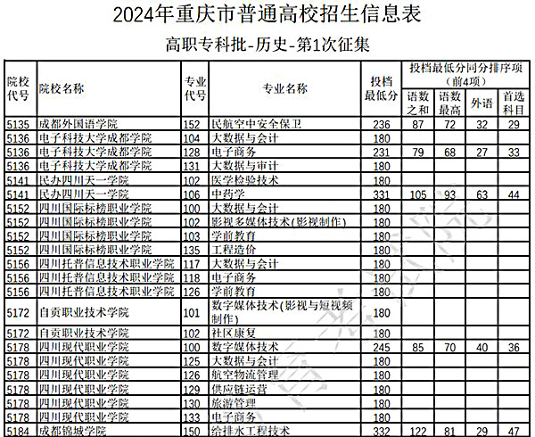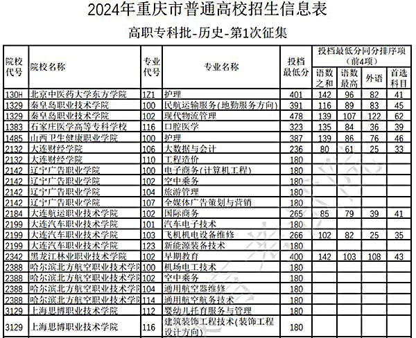 2024年重庆普通高校高职专科批(历史)第1次征集招生信息
