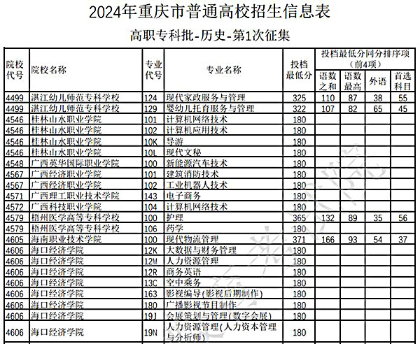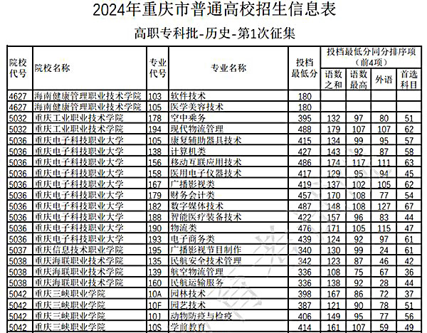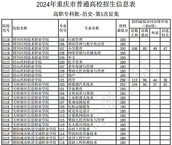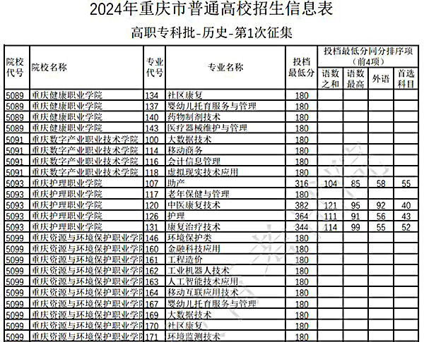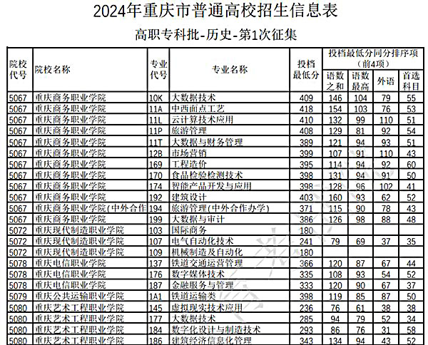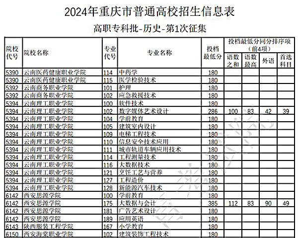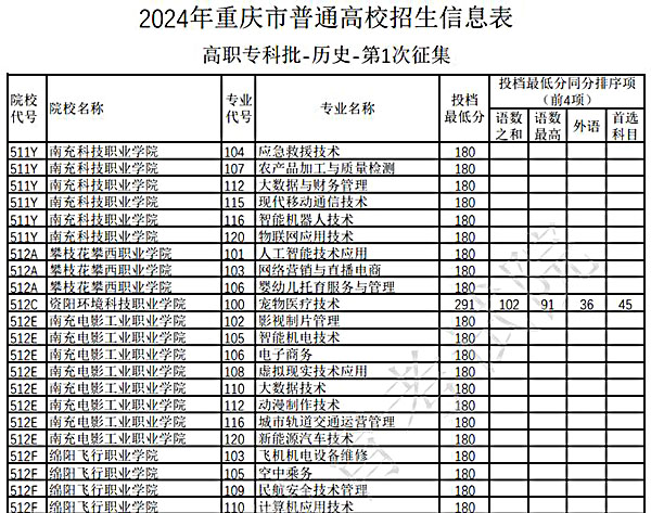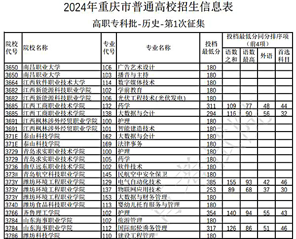 据重庆市教育考试院发布,关于2024年度重普通高校高职专科批(历史)第1次征集志愿招生信息已公布,具体如下: