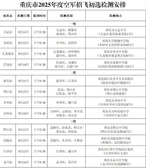 重庆市2025年空军招飞初选检测安排发布时间:2024/9/11 10:19:59 | 人感兴趣 | 评分:3