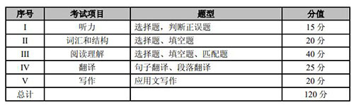 考试项目共有五个部分,即听力、词汇和结构、阅读理解、翻译和写作。各部分测试题型和分值如下: