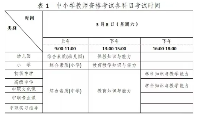 (一)中小学教师资格考试各学段考试科目的具体时间,如下图所示。