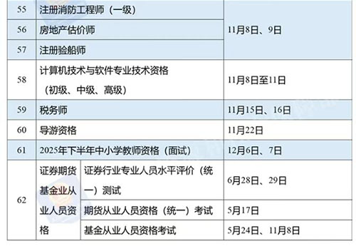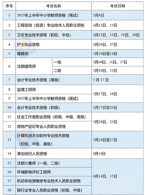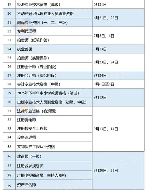人力资源社会保障部办公厅印发《关于2025年度专业技术人员职业资格考试工作计划及有关事项的通知》,具体时间表安排如下: