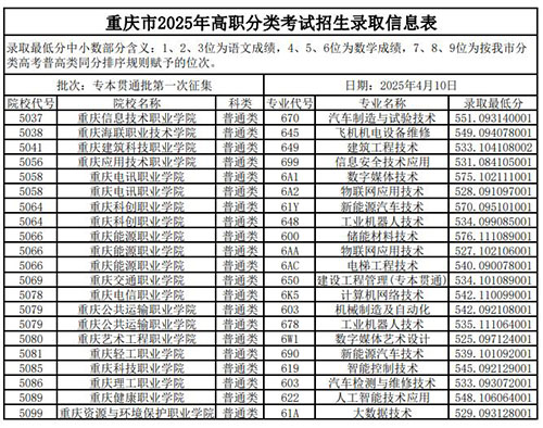 据重庆招考网公布关于2025年度普通高职分类考试(专本贯通批)第1次招生录取信息已公布,具体如下: