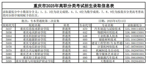 据重庆招考网公布关于2025年度普通高职分类考试(专本贯通批)第2次招生录取信息已公布,具体如下: