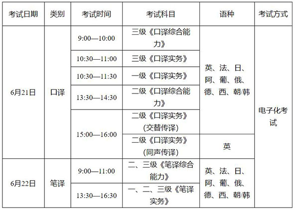 注:1.二级《口译实务》科目分设“交替传译”、“同声传译”2个专业类别,目前仅英语同时开考“交替传译”、“同声传译”,其他语种只开考“交替传译”。通过同声传译考试并符合相应任职条件的人员,可申报评审副高级职称。