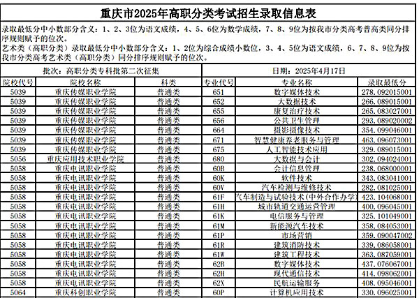 据重庆招考网公布关于2025年度普通高职分类考试(高职分类专科批)第2次征集招生录取信息已公布,具体如下: