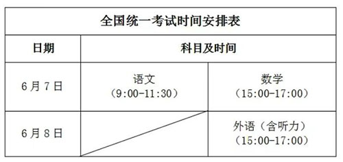(1)全国统一考试。全国统一考试科目考试时间安排在6月7日全天和6月8日下午,其中语文考试时长为150分钟,数学、外语考试时长均为120分钟。