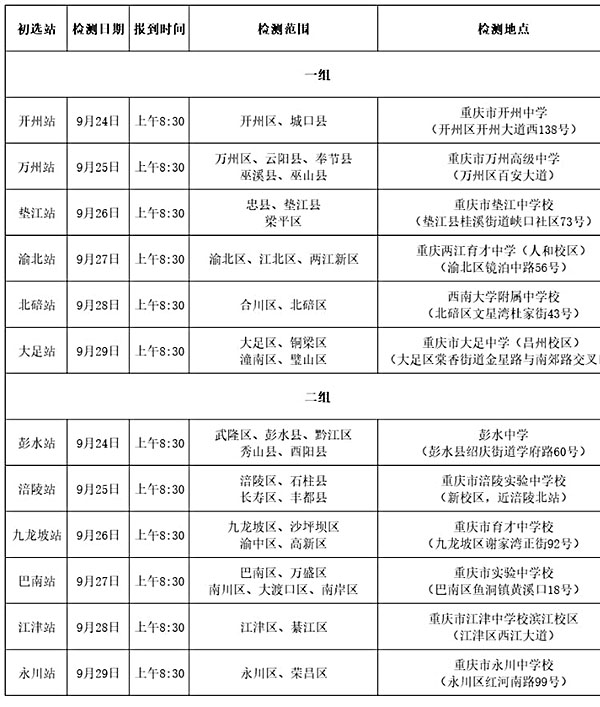 根据年度招飞工作安排,2025年9月24日至29日,空军招飞局成都选拔中心将派工作人员赴重庆组织初选检测。