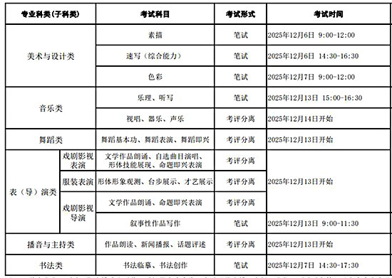 以下关于2026年艺术类专业各考试科目、时间安排: