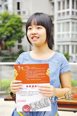 “还有几天就是我的18岁生日,这份高考录取通知书是我最好的生日礼物。”昨上午11时,家住沙坪坝区站西路88号西城丽景小区的黄澄澄同学收到从高考录取场发出的首份高考录取通知书。她被重庆医科大学临床医学专业提前批录取,五年后将成为一名乡镇全科医生。