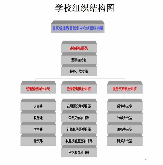 重庆锦途教育培训中心是1996年经重庆市江北区教委批准成立 (办学许可证号:150010570000261),办学层次为在职研究生教育、企业内训及建造师培训。主要以在职研究生教育、职业资格培训、企业内训、成人专本科学历教育为主,各种类别在校生总规模达5000余人。各类教职员工共35人,分设校长、副校长各一名,教务主任一名,学生管理主任一名,会计和出纳各一名,专职班主任(辅导员)10名,各类专兼职教师50余名。设立有招生培训中心、教学管理中心、学生管理中心、财务部、办公室等职能部门。1999年在江北区教委组织的教学督导评估中,荣获教学督导评估二等奖,我校的教学质量得到了教委领导的高度赞同和认可。