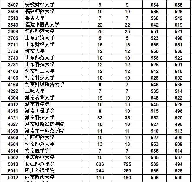 | 5010 | 长江师范学院 | 636 | 725 | 539 | 494 | ||
