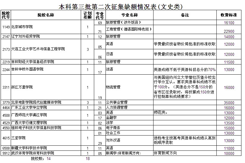重庆三本文科第二次征集缺额情况表