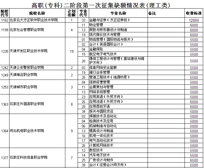 高职(专科)二阶段第一次征集缺额情况表(理工类)