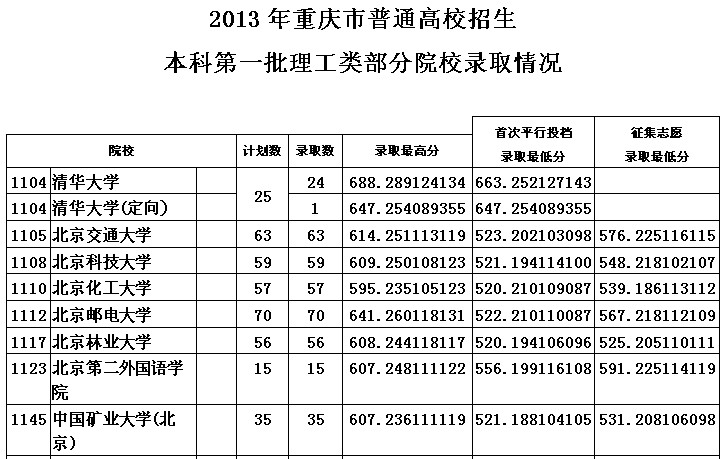 2013各重本大学在重庆招生分数线|招生计划(三)