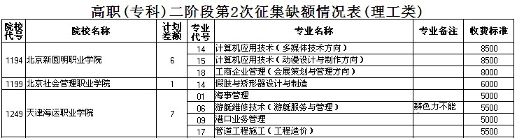 高职(专科)二阶段第2次征集缺额情况表(理工类)